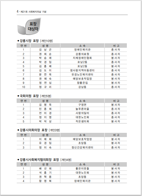 - 주 최 : 강릉시사회복지협의회- 표 창 : 22명(강릉시장상10, 국회의원5, 시의장3, 강릉사협4)