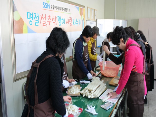 강릉시사회복지협의회에서는 민족 명절 설을 맞이하여 자원봉사자들과 떡국떡을 썰어 관내의 저소득 아동들에게 배분하였습니다.