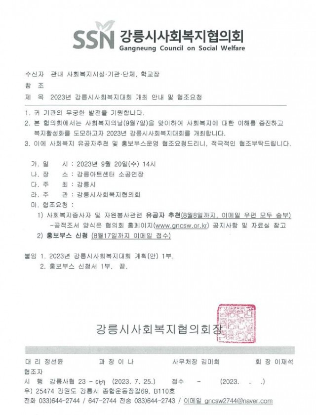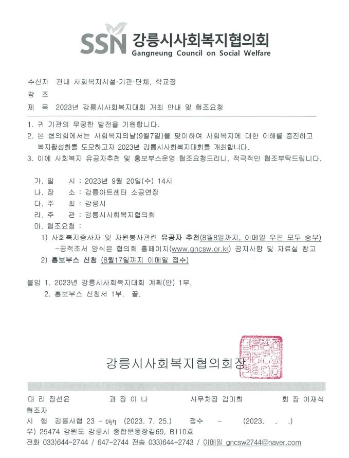 강릉시사회복지협의회에서는 사회복지의 날(9월7일)을 맞이하여 사회복지에 대한 이해를 증진하고 복지활성화를 도모하고자 2023년 강릉시사회복지대회를 개최합니다.