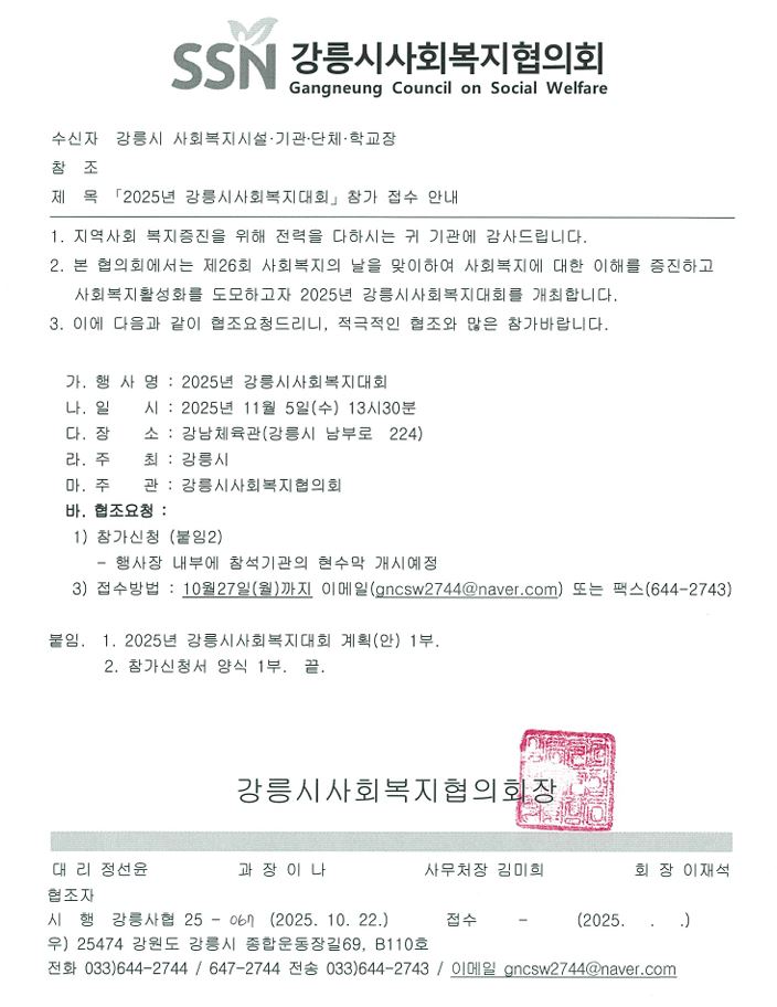 강릉시사회복지협의회에서는 사회복지의 날(9월7일)을 맞이하여 사회복지에 대한 이해를 증진하고 복지활성화를 도모하고자 '2025년 강릉시사회복지대회'를 개최하오니 많은 참여바랍니다.