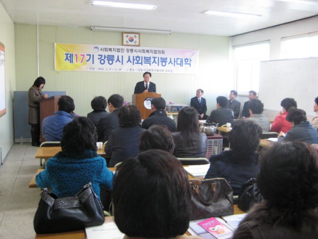 내 용 : 제17기 강릉시사회복지봉사대학 수강생 40명을 모집하여 개강식을 하였습니다.
